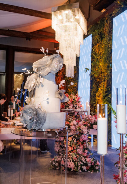 Além disso, o bolo de aniversário chamou a atenção pela decoração estilosa. O doce teve cinco camadas e flores modernistas feitas de açúcar e outras folhagens brancas para dar movimento à decoração.